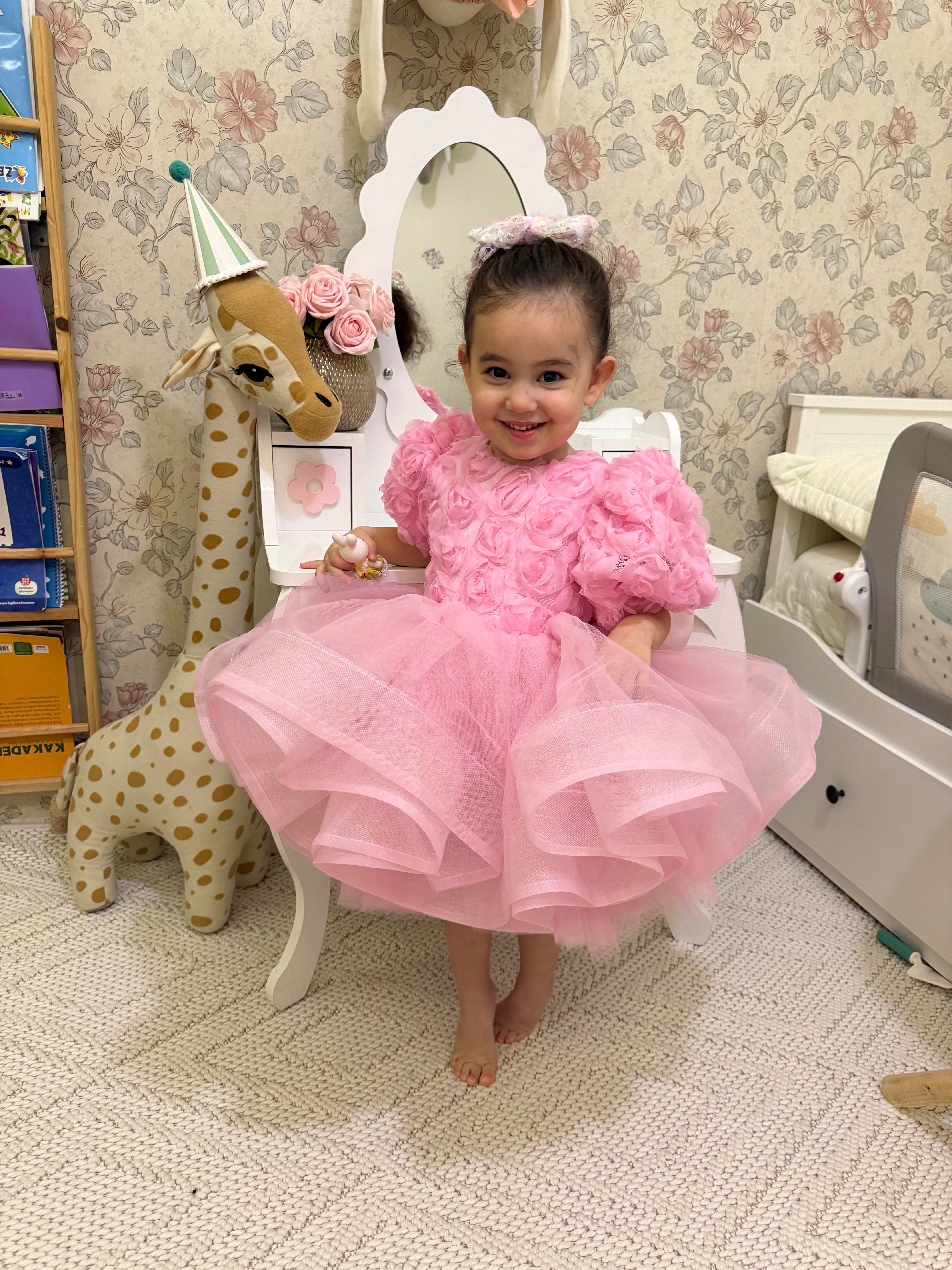 Perla Pink Girls’ Evening Dress with Closed V-Neck and Rose Organza Detail